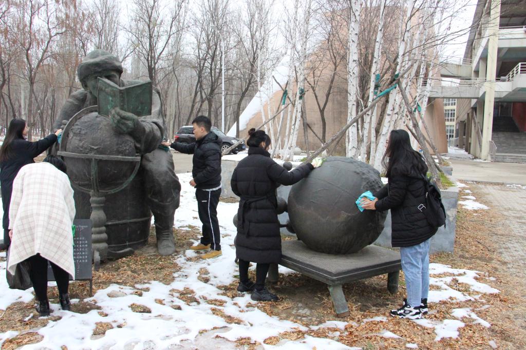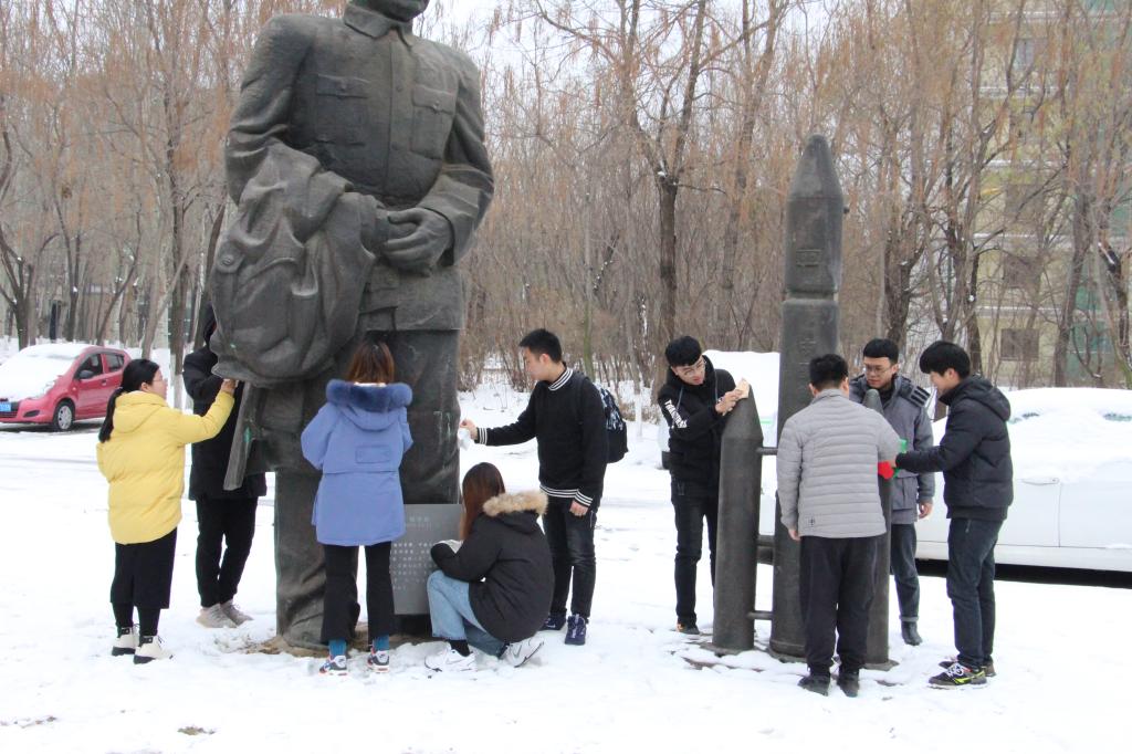 广场中心的主题雕塑“世纪之星”为沈阳市21世纪广场主题雕塑“科学巨匠世纪之梯”的顶部构件,是沈阳城市历史的时代标志之一。世纪之星四周为一组高大的伟人雕塑,分别为中国“两弹一星”奠基人钱学森,世界著名物理学家恩里科,费米和大陆漂移说的创始人魏格纳。各组员学习了解了三位伟人的先进事迹和思想,并认真清理雕像上的灰尘和积雪。