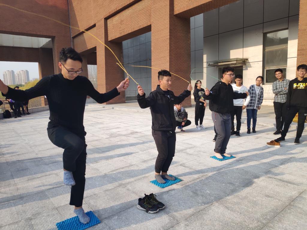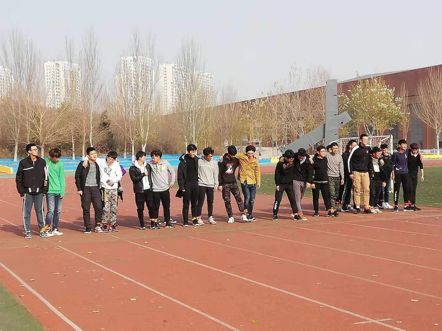 活动开始全体成员来到第一塑胶体育场并按照之前的分组列队。在主持人开场并强调安全问题后,素质拓展正式开始。首先进行的环节是两人三足,每组出两人,由两个人团结协作,两人并排站立,一人左腿与另一人右腿的膝盖以下,脚踝以上部分用绳子绑上。比赛在起点处开始出发,至对面标志处折回,返回至起点处,再将绳子解后,交给下一组队员进行比赛,最后以完成时间长短进行排名。每组按成绩排名可获得详细程度不等的文字线索,一共分为三个回合。参加比赛的同学们和队友团结一致,默契配合,都取得了不错的成绩。尤其第三组(学术部与秘书处),第六组(女工部与社管部),第九组(组织部与思教部)分别获得了三个回合的冠军,获得了下一环节活动地点的相关线索。