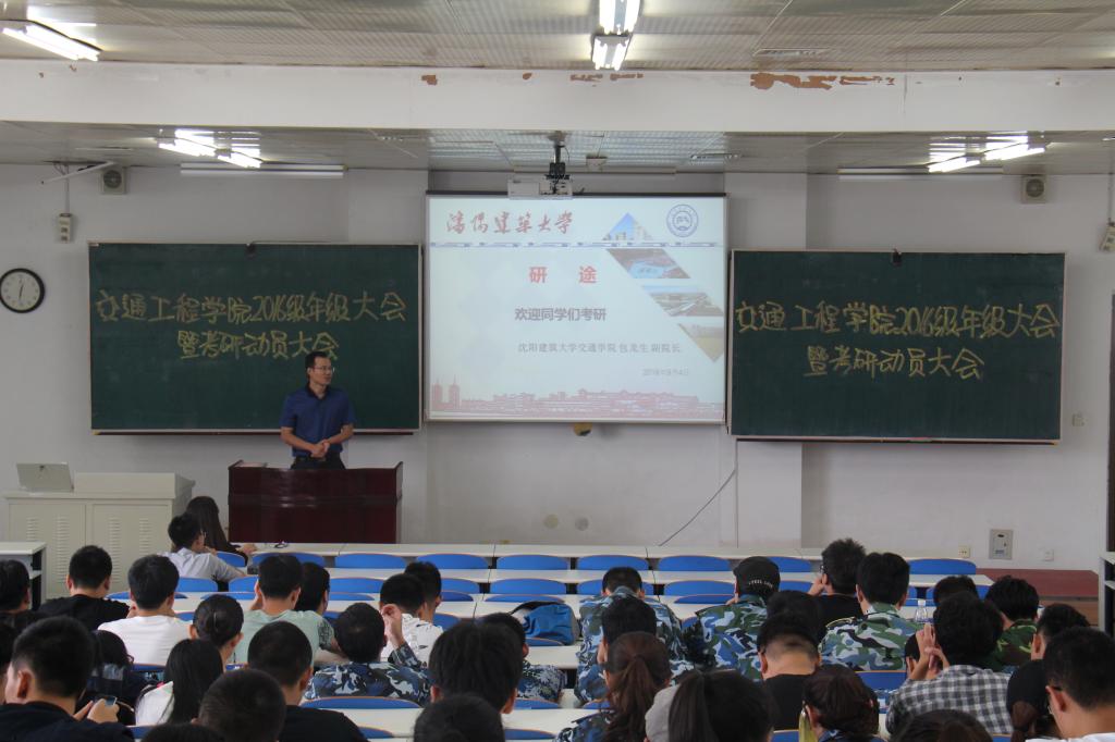 9月4日,为激发16级同学考研热情和学习热情,交通工程学院在学校甲1-401教室召开2016级考研动员大会。交通工程学院副经理包龙生、16级兼职辅导员田晓娜及16级全体员工200余人参加了本次大会。